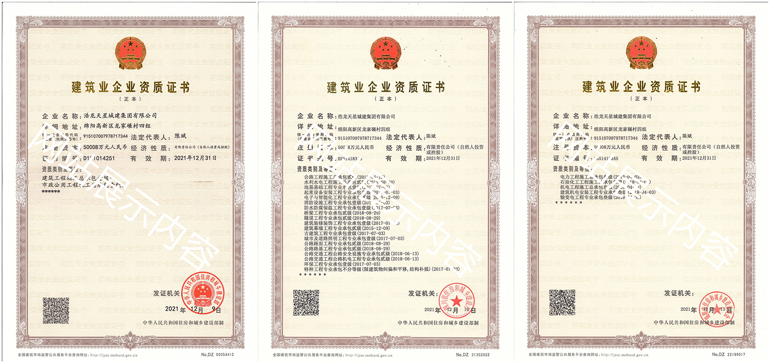 浩龍?zhí)煨浅墙瘓F(tuán)有限公司,2007年成立于“李白故鄉(xiāng)、中國科技城”—四川省綿陽市,企業(yè)注冊資本金5.0008億元。公司共有27項(xiàng)建筑業(yè)企業(yè)資質(zhì),其中國家一級資質(zhì)11項(xiàng),二級資質(zhì)10項(xiàng),三級資質(zhì)5項(xiàng),特種資質(zhì)不分等級1項(xiàng),類別涵蓋建筑、市政、水利、機(jī)電、隧道、起重設(shè)備安裝等基礎(chǔ)及未來發(fā)展重點(diǎn)專業(yè)。公司下設(shè)三個(gè)辦事處,業(yè)務(wù)范圍輻射全國,在建項(xiàng)目三十余個(gè),累計(jì)完成產(chǎn)值超11億元。公司是綿陽市建筑施工企業(yè)協(xié)會(huì)副會(huì)長單位、綿陽遂寧商會(huì)會(huì)長級單位、綿陽首批建筑業(yè)綠卡企業(yè),在綿陽本地企業(yè)中綜合實(shí)力名列前茅。